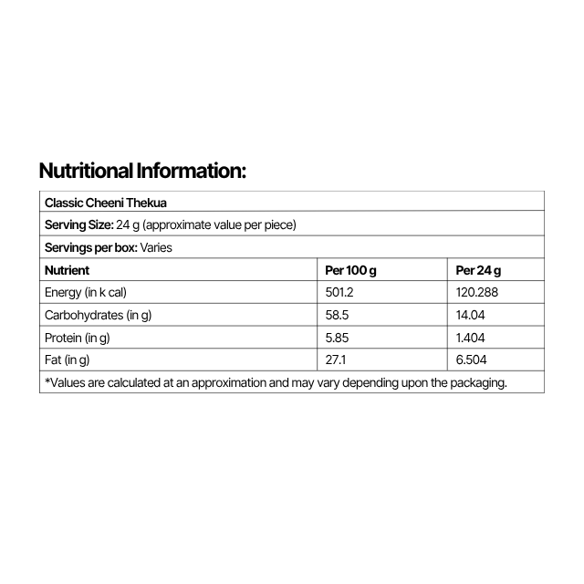 Each box contains freshly made, handcrafted thekuas packed safely to retain freshness and crunch.