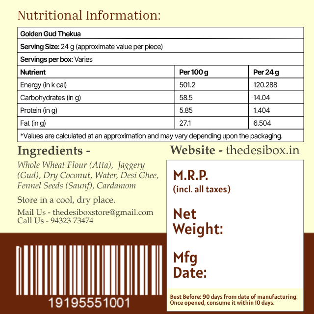 Classic Cheeni Thekua is made with sugar, giving it a light sweetness, while Golden Gud Thekua is made with jaggery, offering a richer, caramel-like flavor.