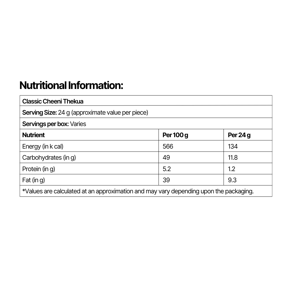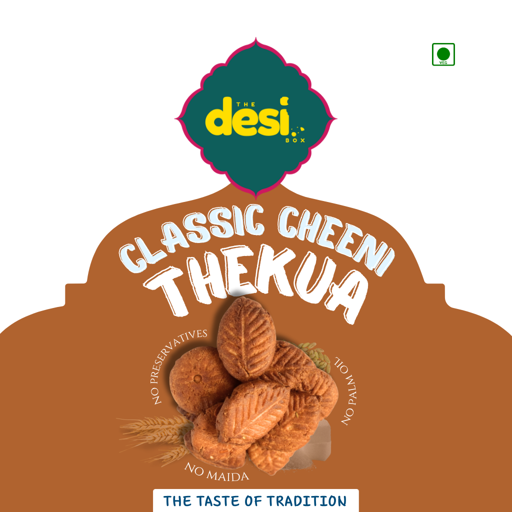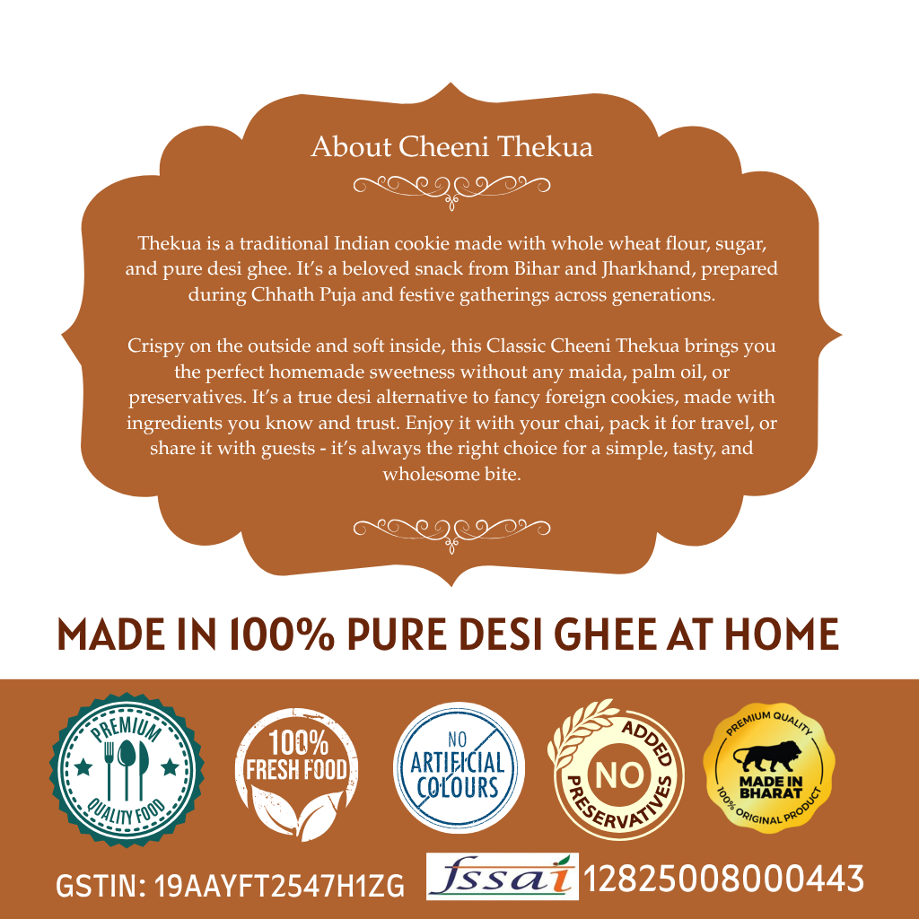 The Classic Cheeni Thekua has a crisp bite with a balanced sweetness that comes from sugar, making it a comforting choice for those who prefer the classic taste over jaggery-based variations. The use of atta instead of maida gives it a fuller, more satisfying texture, while desi ghee adds depth and aroma. Coconut and fennel bring subtle layers of flavour that make every bite feel complete and traditional.