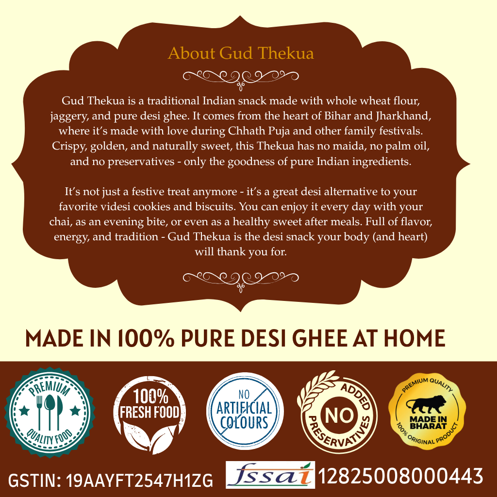 Gud Thekua, also known as Gur Thekua or Jaggery Thekua, is a traditional sweet snack deeply rooted in the cultural heritage of Bihar and Jharkhand. It is especially prepared during Chhath Puja, family gatherings, and festive celebrations. This authentic Atta Thekua is made using whole wheat flour, natural jaggery, and pure desi ghee, which gives it its rich texture and earthy sweetness.