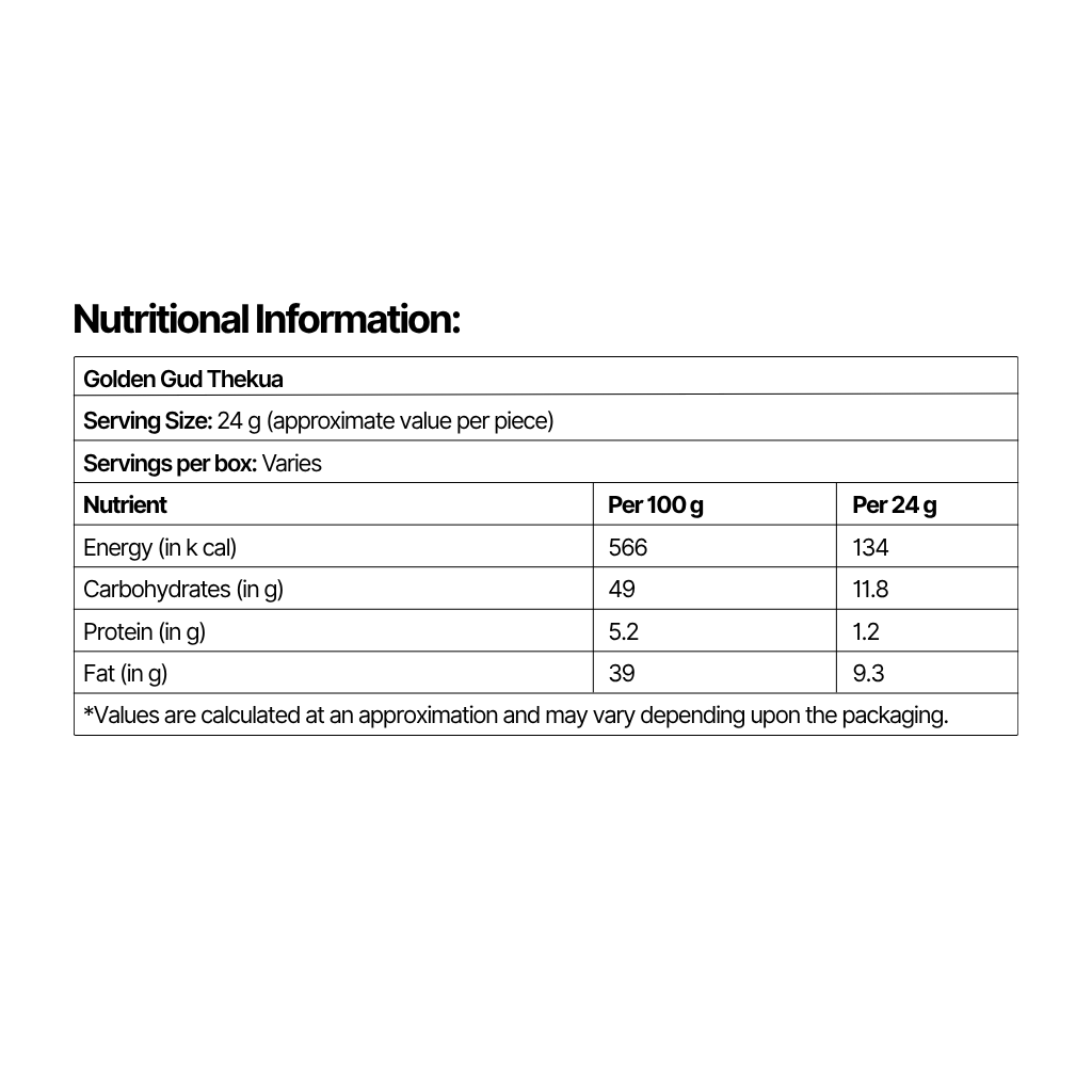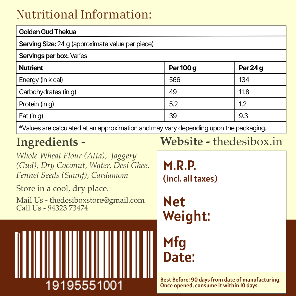 Our gud thekua carries the warmth of festive kitchens and the comfort of homemade snacks shared with family. The use of whole wheat flour makes this whole wheat thekua rich, hearty, and satisfying, while jaggery adds a natural sweetness that feels wholesome and traditional. Unlike regular biscuits or cookies that are full of refined flour, sugar, and palm oil, The Desi Box’s Golden Gud Thekua contains: